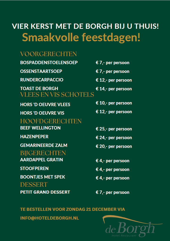 Bestellingen voor Kerst graag via mail naar: info@hoteldeborgh.nl