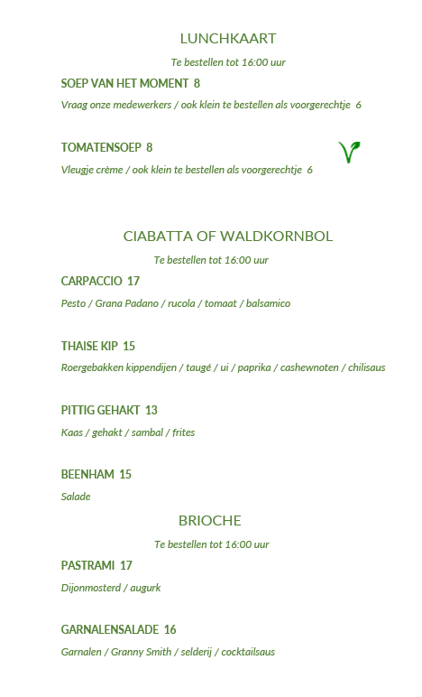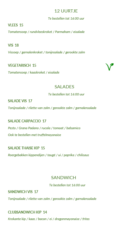 Alles is de hele week te bestellen en kan worden afgehaald tussen 11:00 en 20:00 uur (lunch tot 16:00 uur) of kom langs en geniet van nog meer heerlijke gerechten in ons restaurant of bij mooi weer op ons terras.